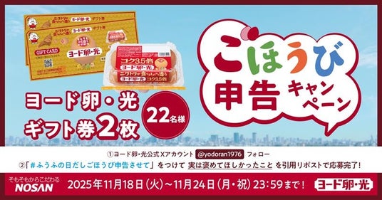 『ごほうび申告ステーション』のイベント開催を記念した、Xキャンペーンを実施します。『ヨード卵・光』公式Xアカウントのキャンペーン投稿に対して、下記の方法で応募いただいた方の中から、抽選で合計22名様に『ヨード卵・光』ギフト券を2枚プレゼントします。■実施期間:2025年11月18日(火)~11月24日(月・祝)23:59まで
