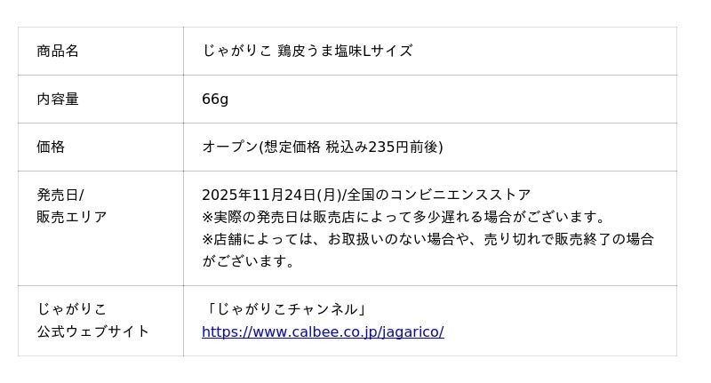 カルビー株式会社(本社:東京都千代田区、代表取締役社長兼CEO:江原 信)は、独自の製法で"はじめカリッとあとからサクサク"の心地よい食感が楽しめる「じゃがりこ」ブランドから、塩をまぶして焼き上げた鶏皮の脂のうま味が楽しめる『じゃがりこ 鶏皮うま塩味Lサイズ』を、2025年11月24日(月)から全国のコンビニエンスストアで期間限定発売します。(2026年7月上旬終売予定)。