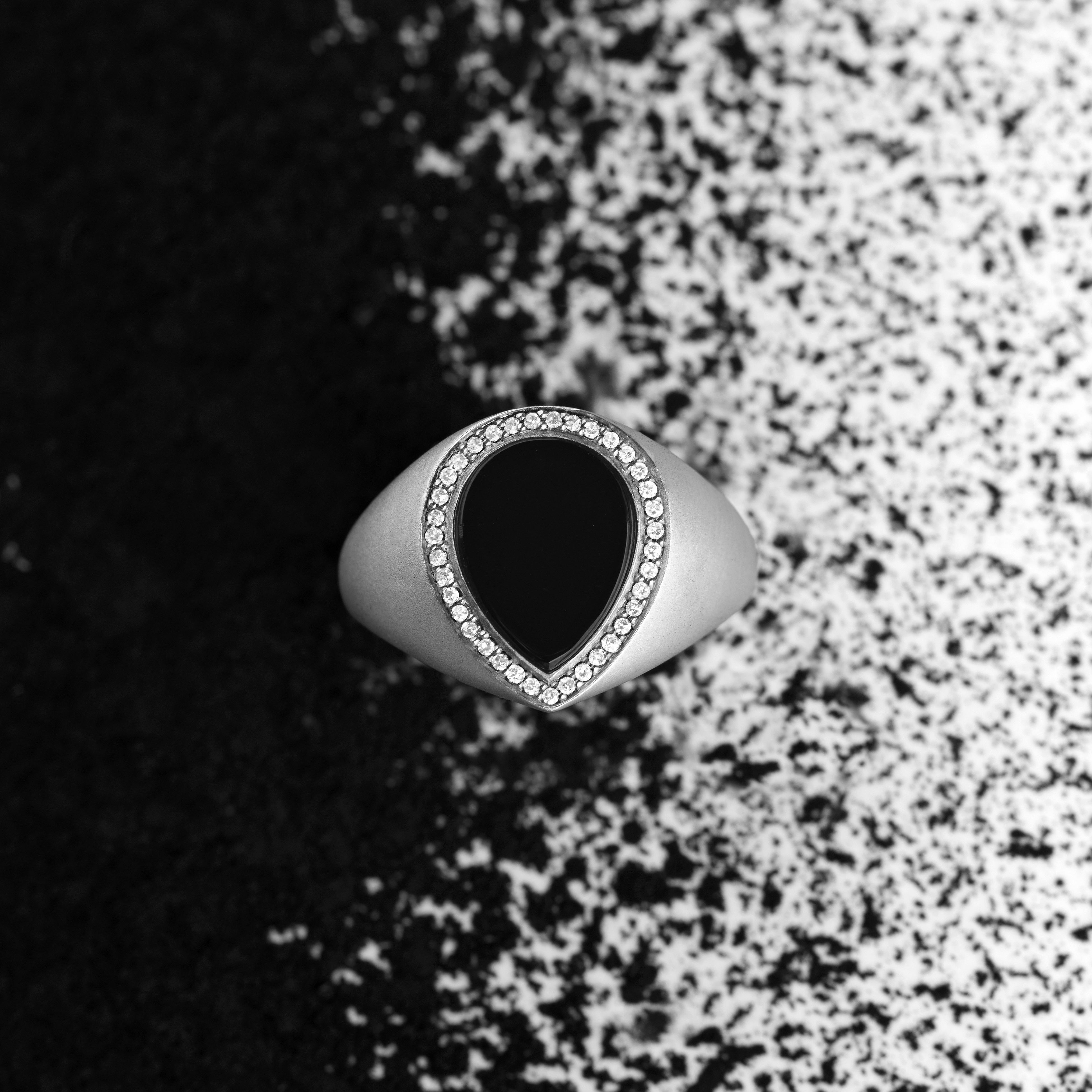 Chevalier Ring Noir(ノワール)は深いオニキスとピュアなダイヤモンドを大胆に組み合わせたデザイン。ドロップ型とオーバル型があり、洗練された存在感を放ちます。重厚な「光」と漆黒の「影」のコントラストが、身に着ける人に揺るぎない自信を与えてくれます。