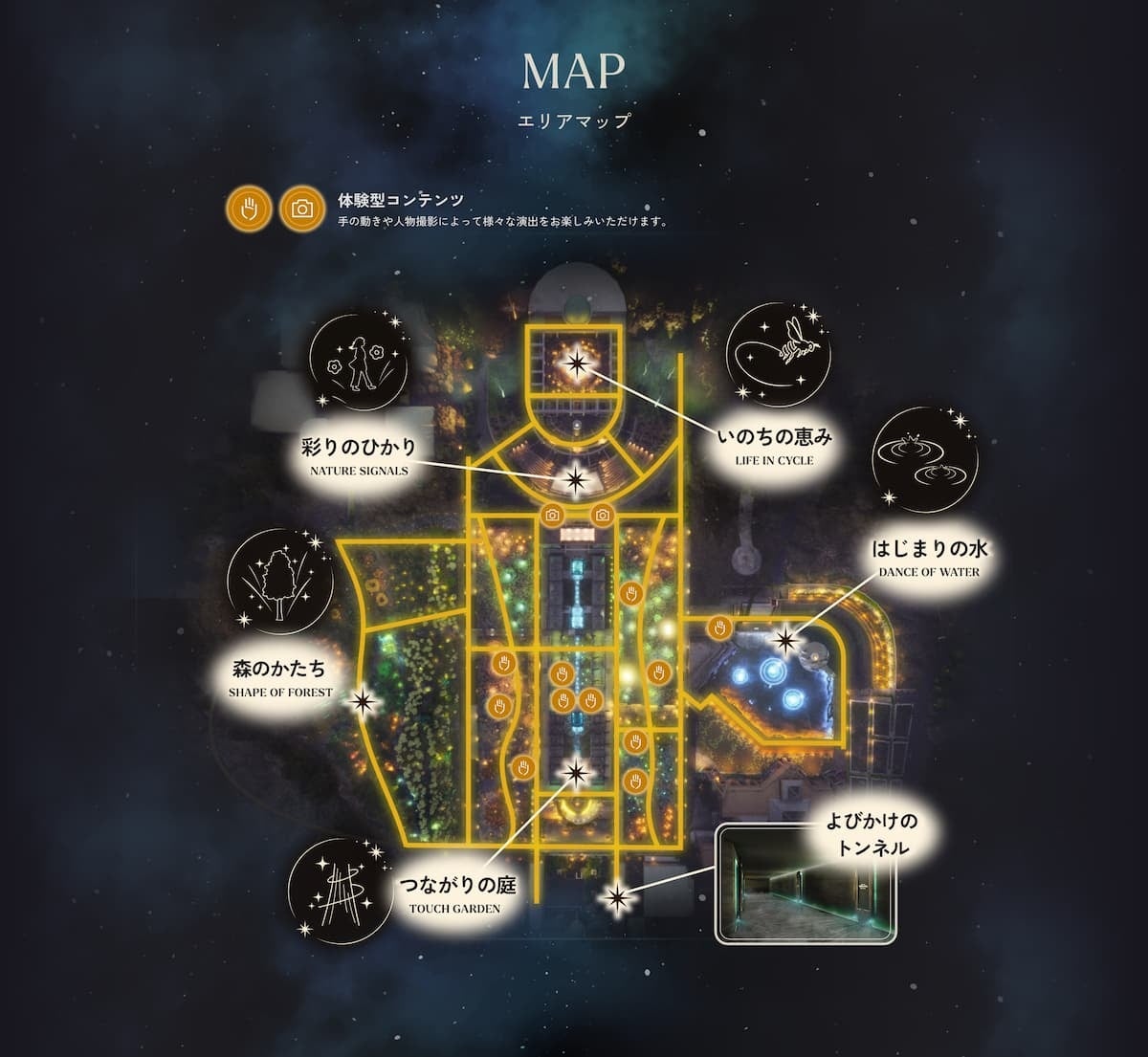 物語は「つながりの庭」「彩りのひかり」「森のかたち」「はじまりの水」「いのちの恵み」という5つの章で構成されています。それぞれのエリアで、テーマに沿ったインタラクティブな体験が来場者を待ち受けます。
