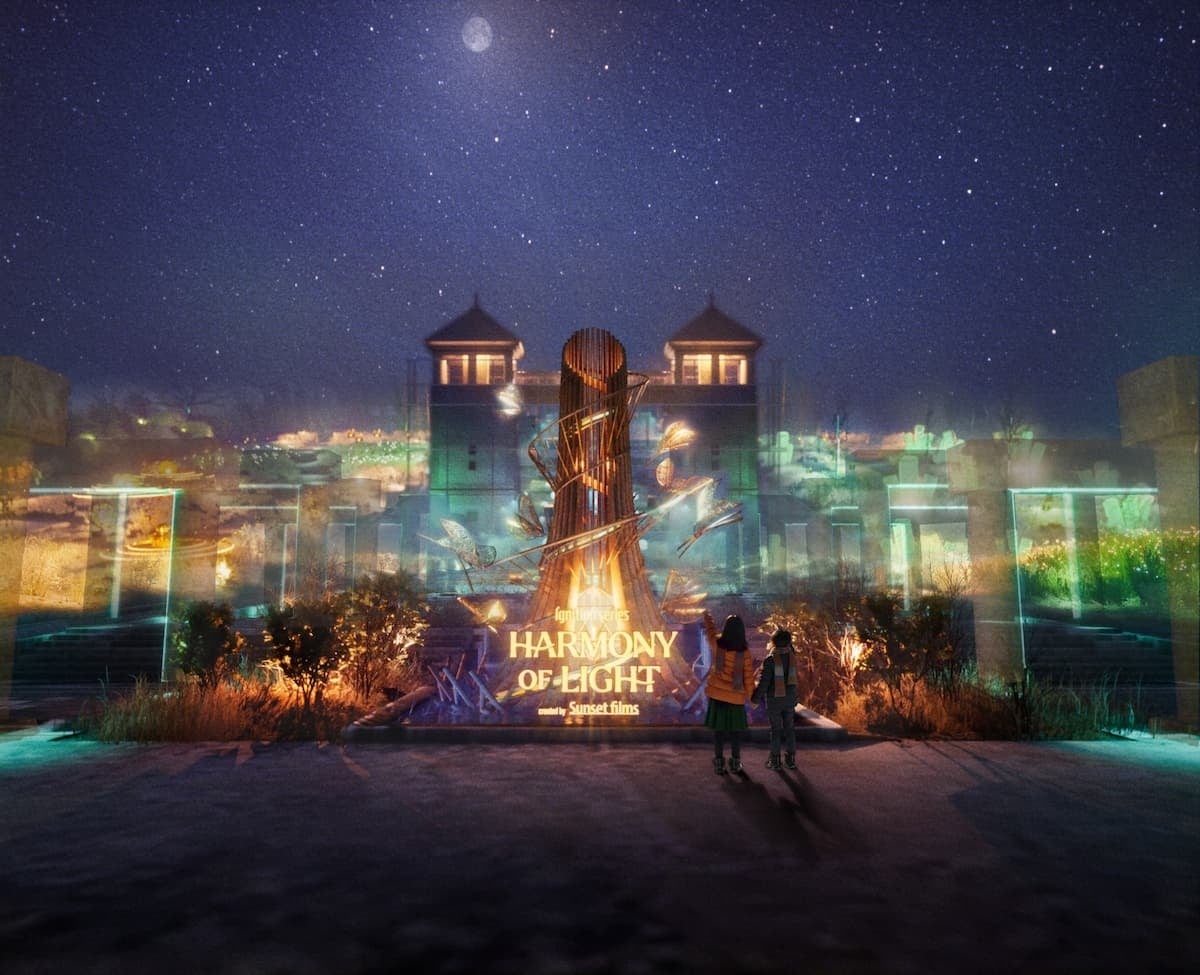 従来のイルミネーションイベントは「見る」ことが中心でしたが、『HARMONY OF LIGHT』は園内を巡る周遊型の体験として設計され、来場者の動きや所作に反応して、光・音・映像・プロジェクションマッピングが変化します。