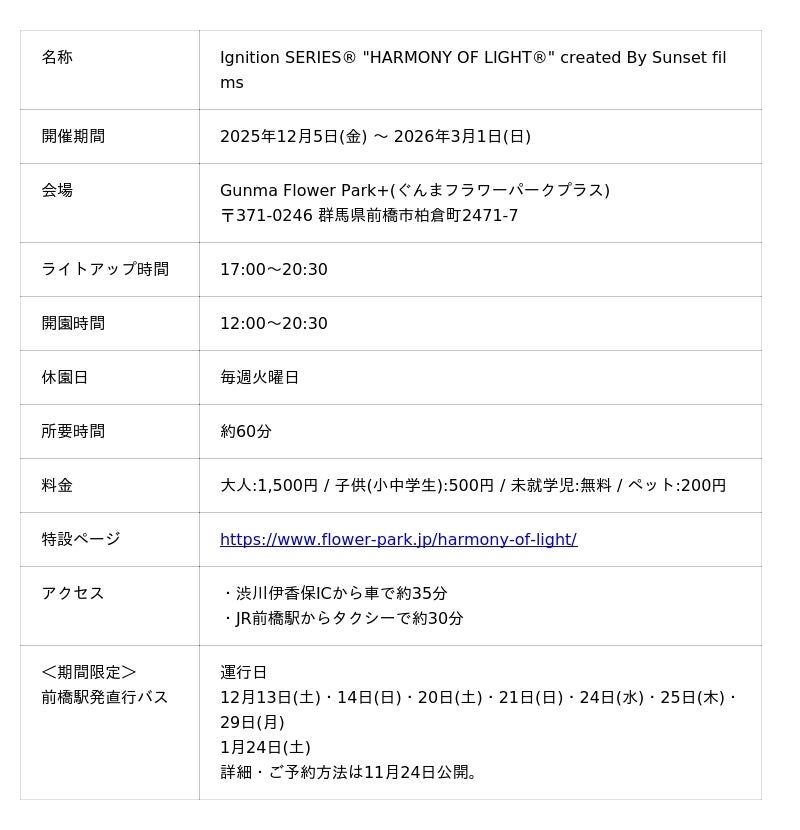 株式会社Sunset films(本社:群馬県高崎市、代表取締役:井埜涼太)は、2025年12月5日(金)より、Gunma Flower Park+(ぐんまフラワーパークプラス)にて、同社が手がける没入体験型ナイトウォークシリーズ「Ignition SERIES created by Sunset films(R)︎」の最新作Ignition SERIES『HARMONY OF LIGHT(R)︎』created by Sunset filmsを開催します。