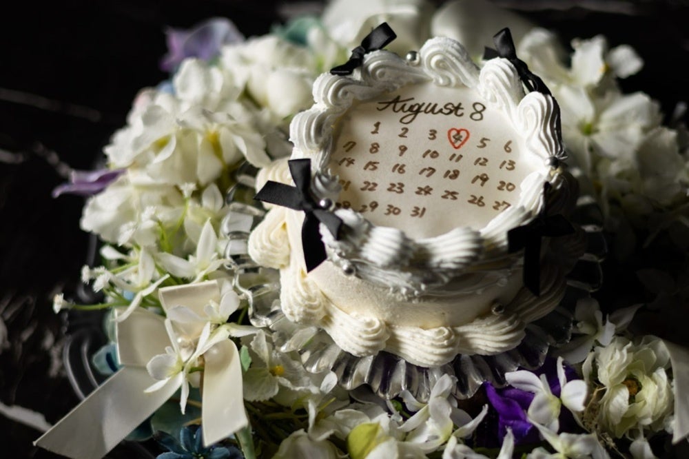 ケーキ上部の燃えるシートには、当日の日付にチェックが入ったカレンダーデザインを採用。
