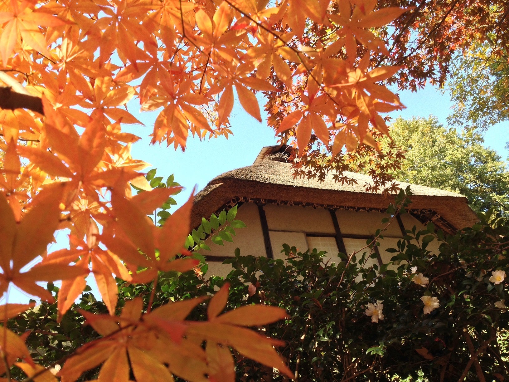 日本民家園にある古民家・佐々木家の周辺ではイロハモミジを見ることができます。民家園の園路や東口から中央広場に向かう手前の三叉路を西口方面へ少し登ったところから撮影すると、古民家とモミジのコラボレーションが楽しめます。