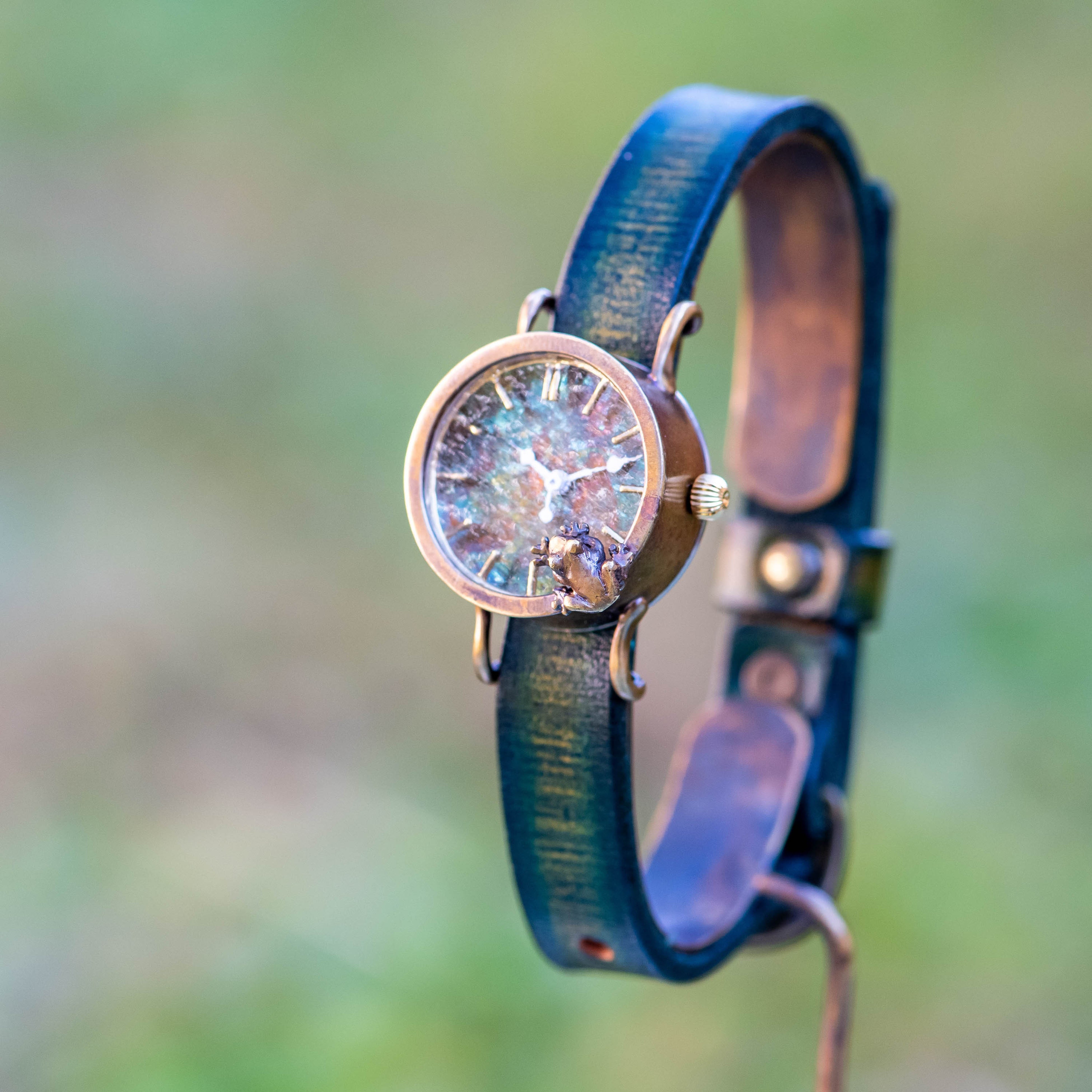 長野で活動する時計職人。色とりどりのステンドグラスを用いた文字盤と、小さなカエルがトレードマーク。