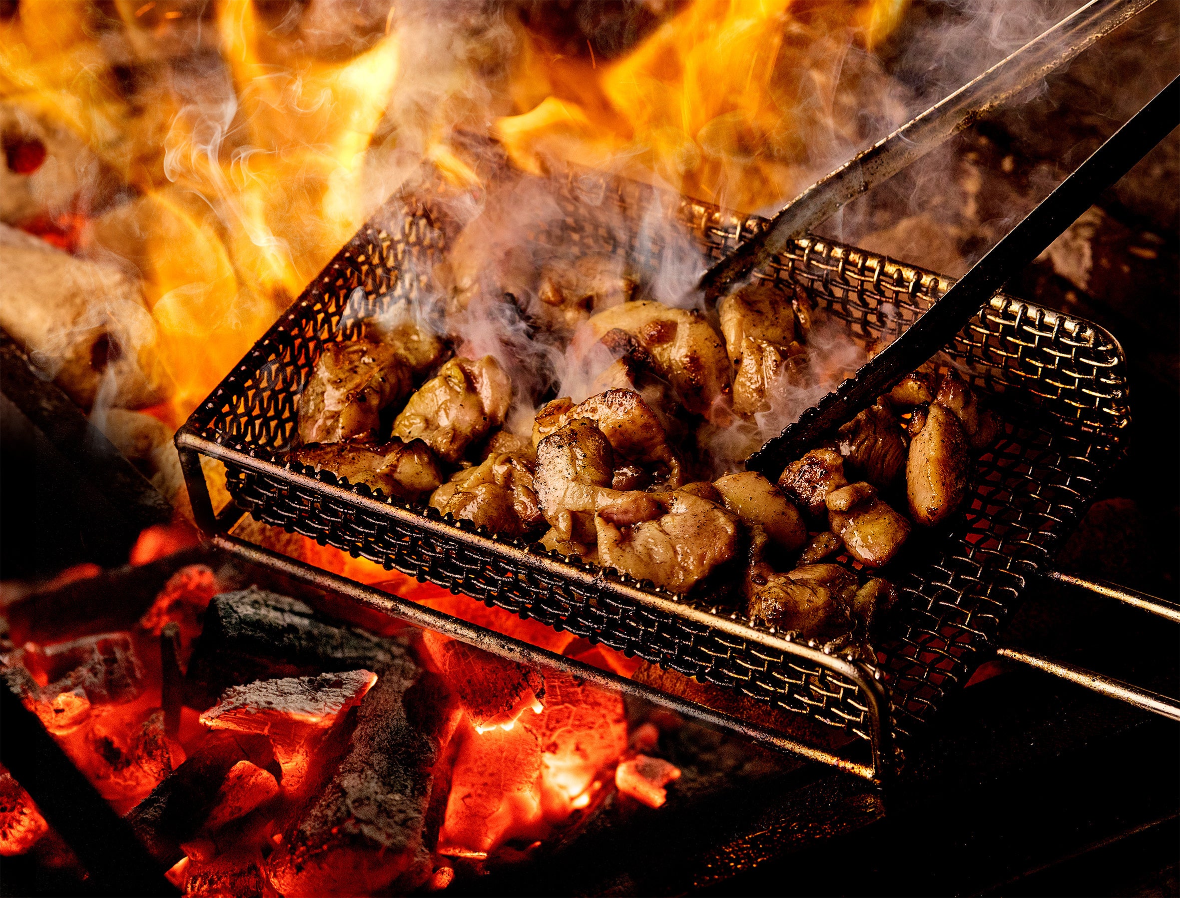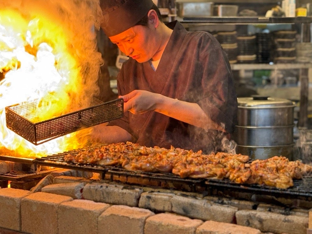 「やきとり屋とりどーる」最大の特徴は、なんといっても本格炭火焼鳥。 「吹田店」も他店舗同様、ご入店いただくと最初に目に飛び込むのは、職人が炭火で丁寧に焼き上げる焼台です。香ばしい香りと、ジュウッと焼き上がる音が、食欲をかき立てます。さらに、店内中央には名物の『肉汁焼売』専用の蒸し場を設置。思わず目を惹く大きなせいろを配置し、どのお席からも蒸し上げる様子がご覧いただけます。ふたを開けた瞬間、湯気とともに立ちのぼる香りが店内を包み込み、食べる前からワクワクをお届けします。また、季節メニューで人気の『炭火炙り焼き』が吹田店限定でグランドメニューに登場!鶏肉を高火力の炭火で豪快に焼き上げ、肉汁をぎゅっと閉じ込めた、炭火の香ばしさと旨みがあふれる一品です。