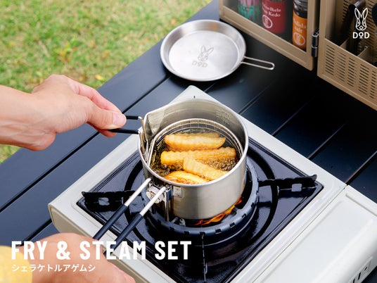 荷物の積載量に限りがあるキャンプにおいて、調理器具の厳選は欠かせません。しかし、限られた道具ではキャンプ料理のレパートリーに幅が出せず、せっかくの食事がマンネリ化してしまうという課題があります。そこで、2024年10月より販売している広口ケトル「シェラケトル」に、ぴったり収まる揚げ物フライヤー兼蒸し網がセットになった新製品「シェラケトルアゲムシ」を開発しました。