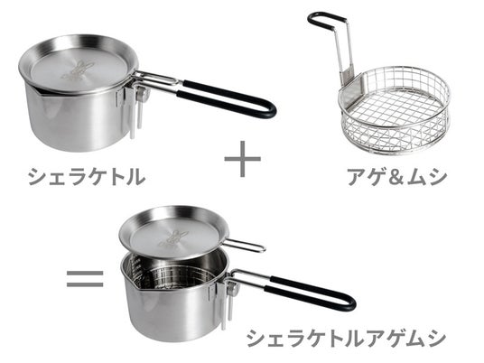 「シェラケトルアゲムシ」は、既存製品「シェラケトル」に新製品「アゲ&ムシ」を組み合わせたオールインワンのクッカーセットです。「アゲ&ムシ」は単品でも発売中です。