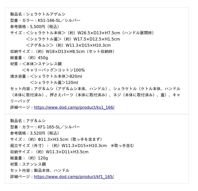 製品詳細ページ:<セット>https://www.dod.camp/product/ks1_166/