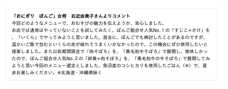【内容】お米は魚沼産のコシヒカリを使用(※)して、ふっくらマシンで、ほどける食感に仕立てたおむすびです。ぼんごで人気No.2の組み合わせ「卵黄+肉そぼろ」を参考にしたおむすびです。肉そぼろは国産黒毛和牛の牛肉を、スライスとミンチをダブルで使用し、肉粒感ある仕上がりを目指しました。卵黄ソースは、とろっとした食感で、卵黄のコクが肉の旨味を引き立てます。ぼんご監修史上最も具材比率が高く、ひと口目から具材の旨味が広がる一品です。