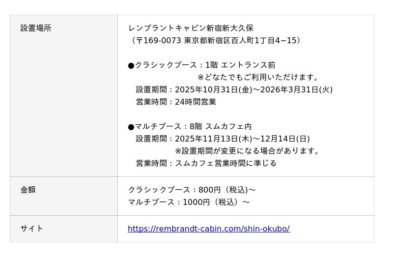 クラシックブースはレンブラントキャビン新宿新大久保のエントランス前にあり、24時間いつでもだれでも利用可能です。新大久保の賑わいが落ち着いた夜遅くや、人々の活動が始まる前の早朝でも、ふとした瞬間の感情を写真に収めていただけます。トレンドに敏感な若者が集まるエネルギッシュな街の中で、「いつでも、だれでも、気軽に良い写真が撮影できる」という自由さによって、新大久保での新しいフォトカルチャーの創出を目指します。時間を選ばず、いつでもだれでも自由な撮影体験を