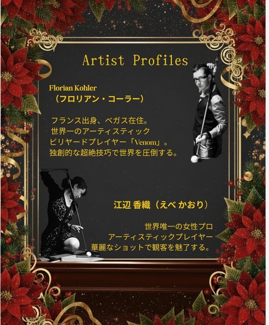 本イベントには、アーティスティック界のパイオニアであり世界的スター フロリアン・コーラー(Venom)、そして世界で唯一の女性プロアーティスティックプレイヤー 江辺香織(Ebe Kaori) が出演。華麗で精緻、そして芸術的なショットが交差する、ここでしか見られないプレミアムなステージをお届けします。