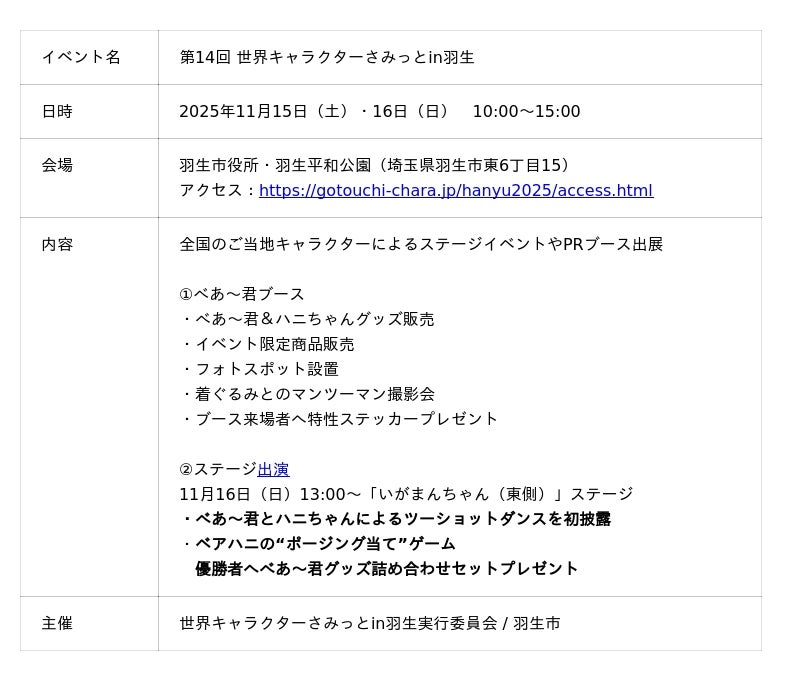 賃貸住宅仲介業店舗数No.1*のAPAMAN株式会社(東京都千代田区・EL CAMINO REA株式会社の連結子会社代表取締役社長 山崎戒)は、公式キャラクター「べあ~君」と「ハニちゃん」が、2025年11月15日・16日に開催された『第14回 世界キャラクターさみっと in 羽生』へ初参加し、2日間で延べ4,000名以上が同社ブースに来場したことをお知らせいたします。
