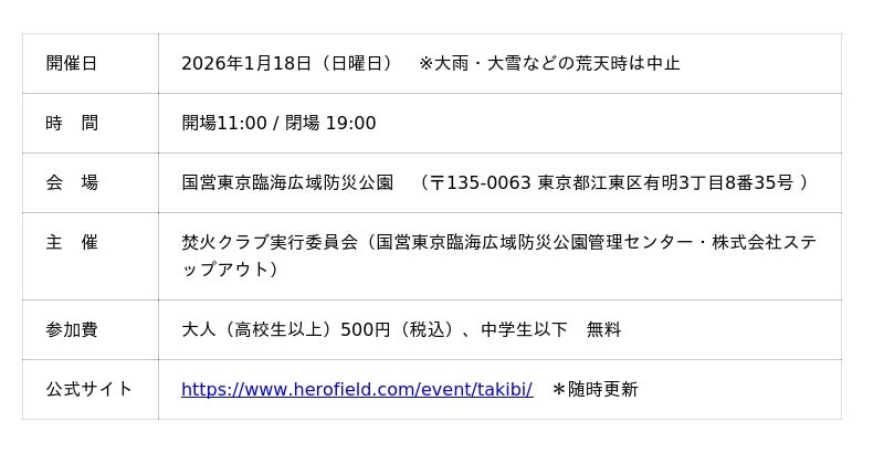 首都圏中心に、バーベキュー場・キャンプ場運営を手がける株式会社ステップアウト(本社:東京都豊島区 代表取締役:北條 拓/丹埜 倫)は、2026年1月18日(日)に「焚火クラブ2026」を国営公園を初会場として、「国営東京臨海広域防災公園」にて開催いたします。