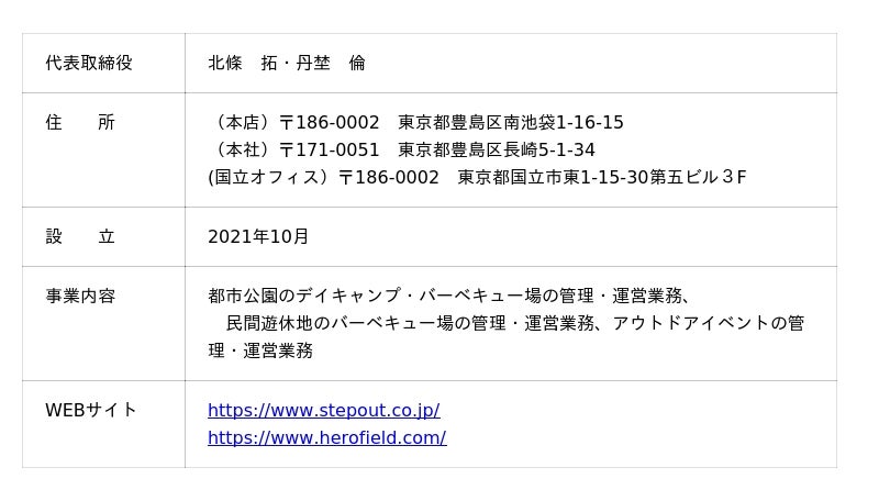 西武グループの造園・緑地事業専門会社として全国の都市公園等の管理運営事業なども手掛ける西武造園株式会社(本社:東京都豊島区 代表取締役社長:小川 巧)と、アウトドア業界のDXのトップランナーである株式会社R.project(本社:千葉県鋸南町 代表取締役:丹埜 倫)の、それぞれの強みを最大限に生かし、都市公園などでのBBQ事業や、遊休地などでのキャンプ事業を展開するためにジョイントベンチャーとして設立。