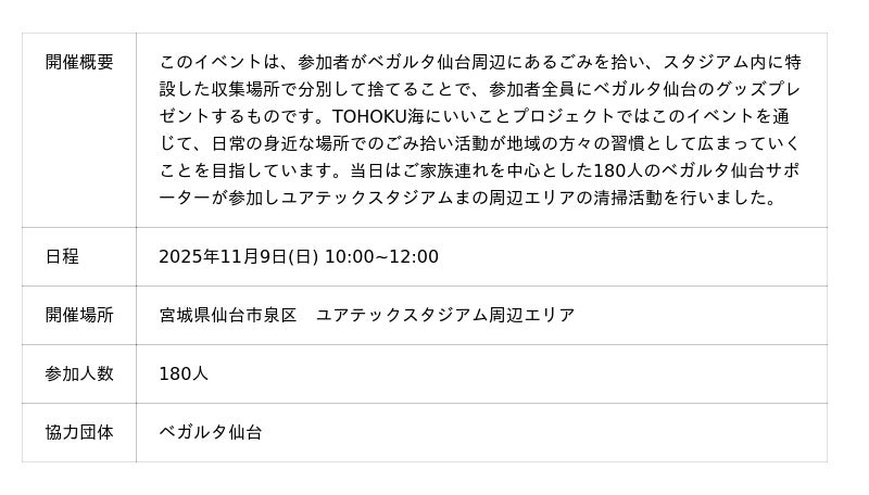 一般社団法人TOHOKU海にいいことプロジェクト(宮城海ごみなくし隊)は、2025年11月9日(日)に生活の中での街のごみ拾い活動の習慣化を目的として、ベガルタ仙台と連携した「ごみを拾ってベガルタ仙台を応援しよう!」を開催いたしました。