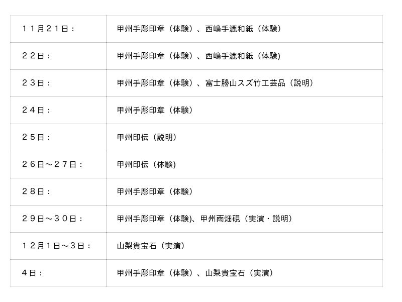 11月21日(金)~12月4日(木)の14日間、山梨を代表する工芸品の展示に加え、職人の実演や、参加型の制作体験も楽しめます。