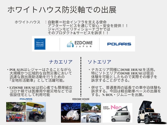 ホワイトハウスは今回は防災軸での出展。中のエリアと、モビリティビレッジでの出展となっています。