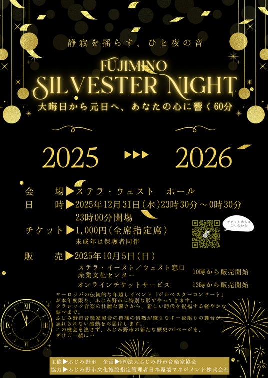 「ふじみ野市誕生20周年」という特別な年に、埼玉県で初となる、「ジルベスターコンサート」を開催します。地域の皆さんとともに一年を締めくくり、新しい年を希望とともに迎える特別な文化イベントです。 大晦日から元日へのカウントダウンと、心に響く名曲の数々。一夜限りの舞台を是非ご堪能ください。