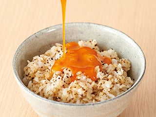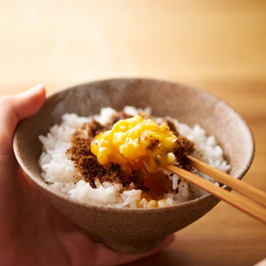 温かいご飯に、昆布の旨みが凝縮した「つぶ昆」を加えて混ぜ、「卵かけご飯の醤油」を加えて溶いた卵をまわしかけたあと、「こな昆」を振りかければ、昆布の旨みと風味たっぷりの "絶品卵かけご飯" の出来上がり!