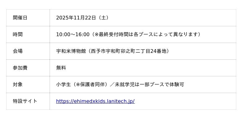「あなたと社会のテクノロジーパートナー」を掲げるlanitech合同会社(本社:東京都渋谷区、代表取締役CEO兼CTO:西脇 靖紘、以下「lanitech」)は、愛媛県が推進する「地域DX実践支援業務」の一環として、子どもたちが未来のデジタル技術を遊びながら学べる体験型イベント 「えひめDXキッズフェスタ2025 in 宇和米博物館」を2025年11月22日(土)に開催いたします。