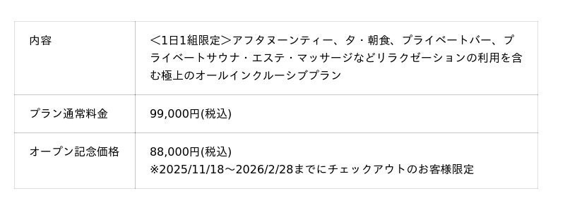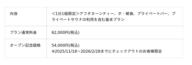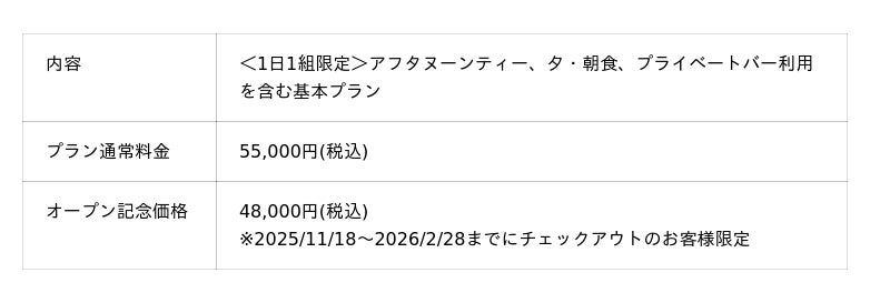宿泊施設のオープンを記念して、期間限定で全プラン特別価格にてご提供いたします。サービスの内容は通常と変わらず、1泊48,000円(税込)~/1名様と大変お得な価格となっております。