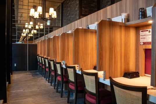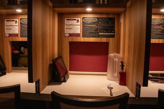 隣の席との間に仕切り板を設けることで周囲を気にせずにお好きなスープスパゲッティを堪能できる空間を演出しています。また注文は席に設置されているタブレットから行うことができ、メニューも席正面ののれんから提供されるため、ご案内からお会計前まで従業員との接触もほぼありません。