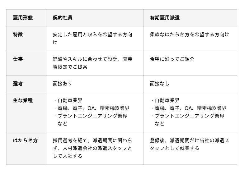 「Tech-Master」では、雇用の安定性が高く給与も安定している契約社員、はたらき方の柔軟性が高く、自分の希望に合わせて就業先を選びやすい有期雇用派遣を選択することが可能※3です。専任のキャリアアドバイザーが、エンジニアのこれまでの経験やスキルをヒアリングし、エンジニア自身の考え方に合わせてどのようなはたらき方を望まれているかなど、これからのセカンドキャリアを提案します。
