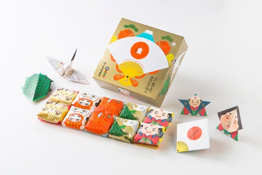 デザインは、"あそびのデザイン"をテーマに活動するデザイン・ユニットCOCHAE(コチャエ)によるもので、来年の干支「午(うま)」や鶴・亀・福助などをかたどった折り紙がつきです。