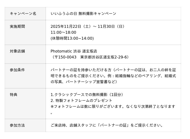 キタムラ・ホールディングス グループのピックハイブ株式会社(本社:東京都新宿区、代表取締役社長 兼 COO:大迫 由典)が展開するセルフフォトブランド「Photomatic(フォトマティック)」のフラッグシップショップであるPhotomatic 渋谷 道玄坂店において、11月22日の「いいふうふの日」に合わせた期間限定キャンペーンを、2025年11月22日(土)から11月30日(日)まで実施いたします。