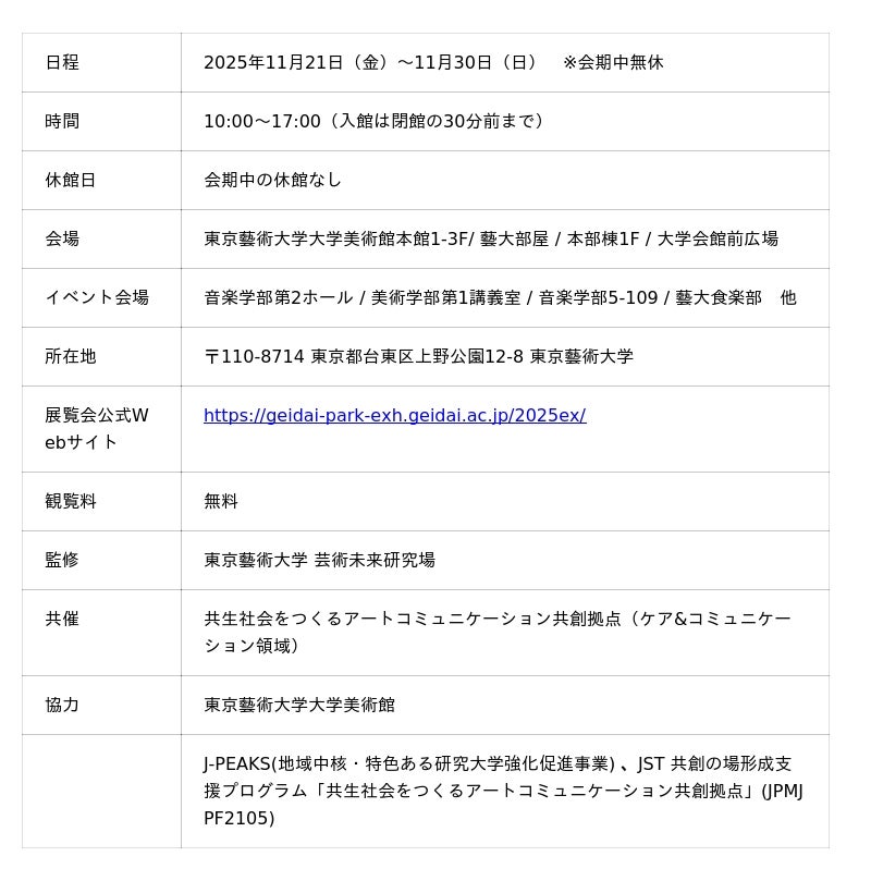場所:〒110-0002 東京都上野桜木2-14-3 東京藝術大学上野桜木地域連携棟