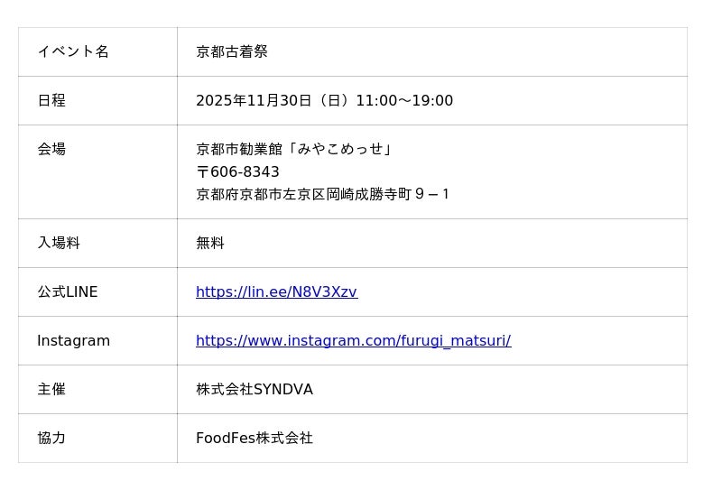 全国の古着屋が集まる「京都古着祭」が、2025年11月30日(日)に京都市勧業館「みやこめっせ」で開催されます。古着祭は2010年に大阪で誕生し、日本初の大規模古着マーケットイベントとして多くの古着ファンから支持を得てきました。毎度、屋外でやって参りました「古着祭」ですが「熱いし/寒いし 体力もたない 」とのお声が少なからずありました。そこで、今回は、初の屋内開催とします!快適な温度と 高音質なBGMでお買い物を思う存分楽しんでください!