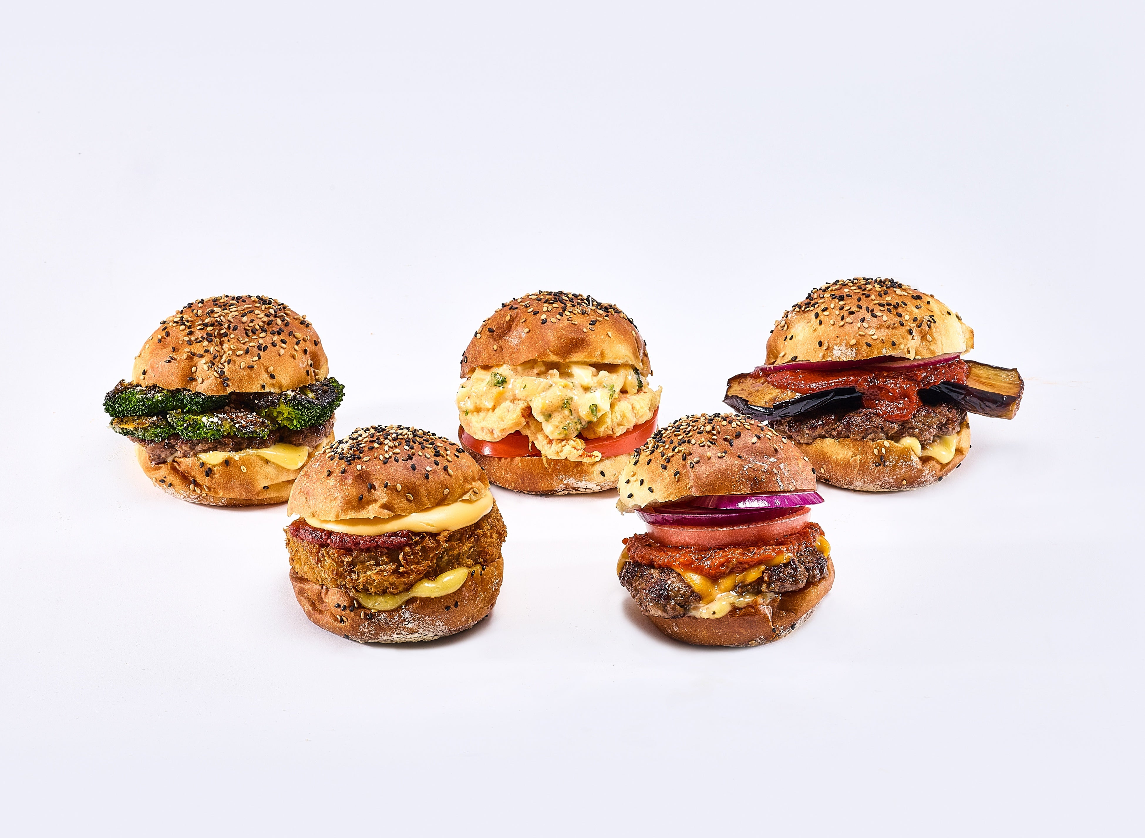 右下から時計回りにネオナイスチーズバーガー/ハムカツグラタンバーガー/ブロッコリーチーズバーガー/海老フライ明太タルタルバーガー/ナスアラビアータバーガー(バンズはすべてプレーン)