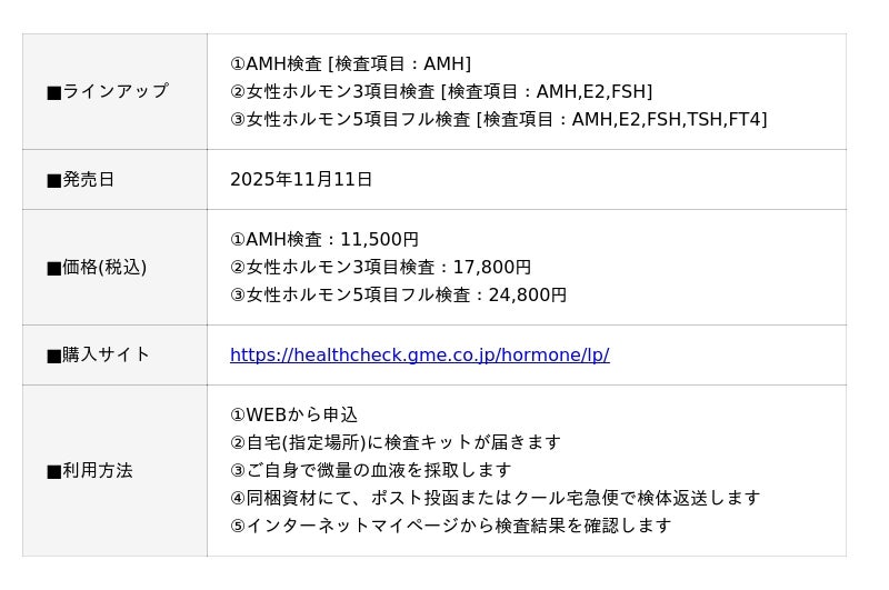 株式会社GME(所在地:群馬県高崎市、代表者:[小和田幸男])が提供する郵送の医学検査サービスにおいて、AMH検査を主体とする複数の女性ホルモン検査を提供開始しました(発売日:2025年11月11日)。