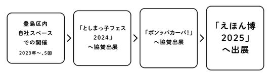 "やってみようえほん展"は今まで自社のクリエイティブスペースでの開催に留まらず、2024年11月には自由学園明日館での【としまっ子フェス2024】、2025年4月には東池袋のイケ・サンパークでの【コトおこしキャラバン ポンッパカーバ!】へ協賛出展しました。さらに2025年11月に代官山 蔦屋書店で開催された【えほん博】への出張出展で初めて豊島区を飛び出し、ものづくりの輪を広げてきました。