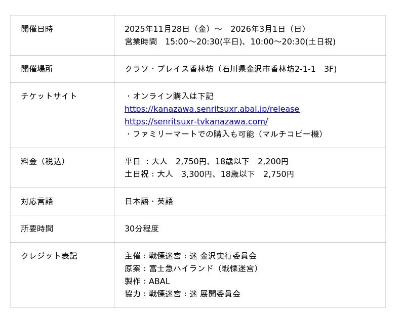 【金沢・11月27日先行メディア体験会開催】2025年夏、東京タワーで大好評の中終了した、VRホラーアトラクション『戦慄迷宮:迷』が2025年11月28日(金)から、クラソ・プレイス香林坊にて開催!