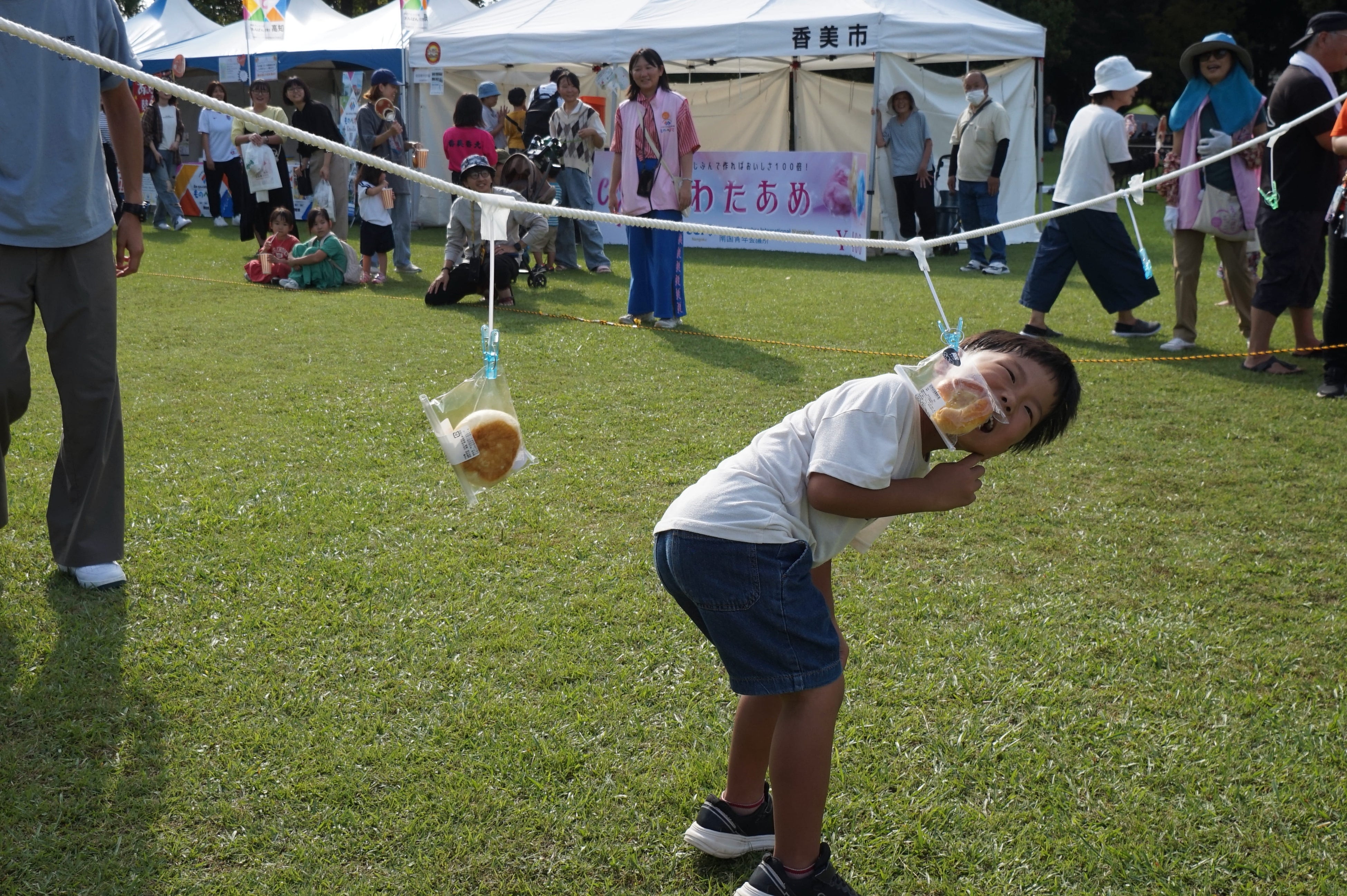 小さなお子さんから大人の方まで満員御礼の50名が参加。この日の最高齢である80代の女性は「あんぱん食い競争は初めてだけど、祭りだから楽しまんと!」と参加理由を話していました。