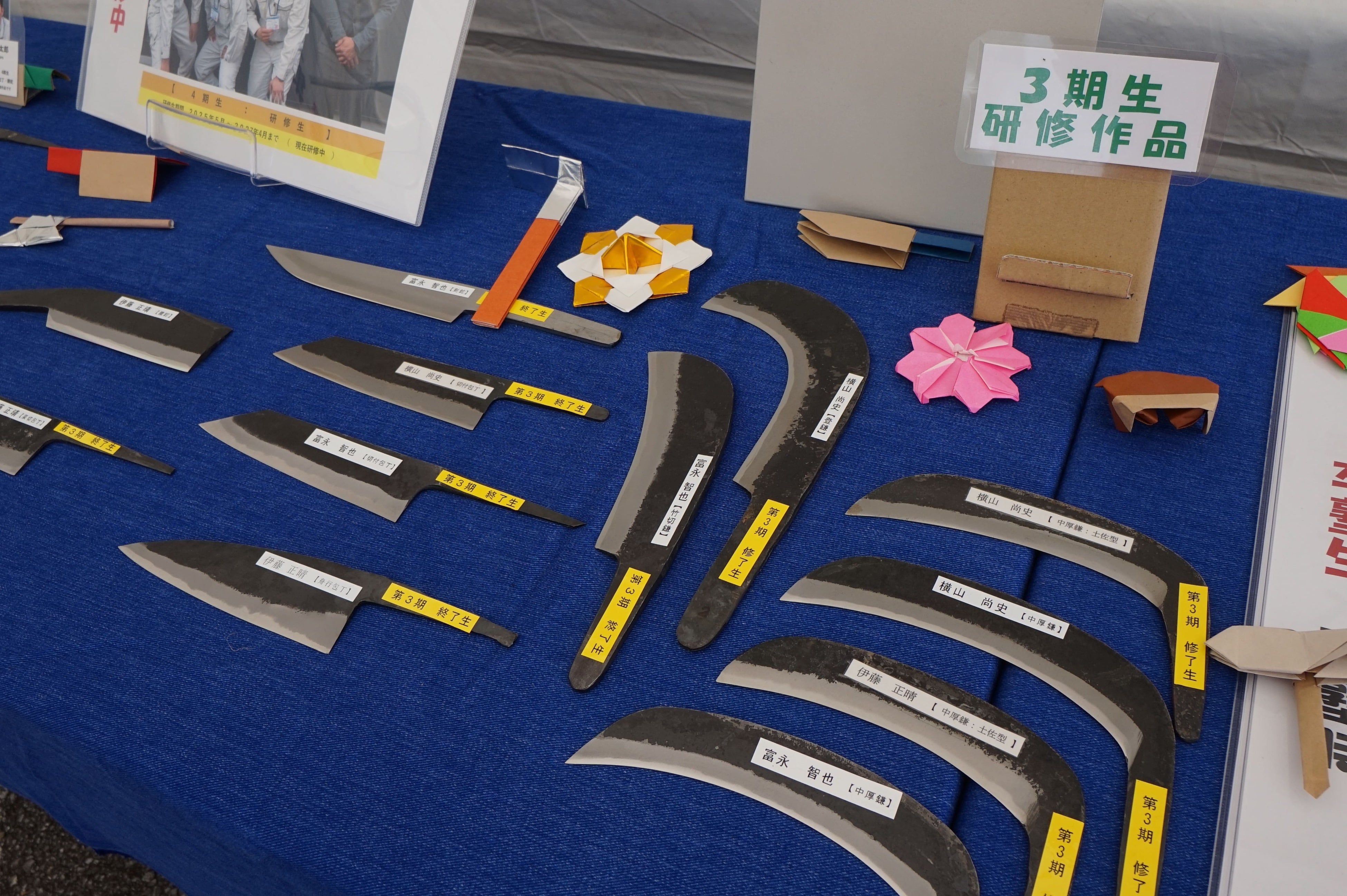 また、コーナーの一角には、未来の土佐打刃物の鍛冶職人を育成する機関・鍛冶屋創生塾のブースもあり、塾生たちの作品展示や土佐打刃物のPR、さらに塾生の募集も行っていました。