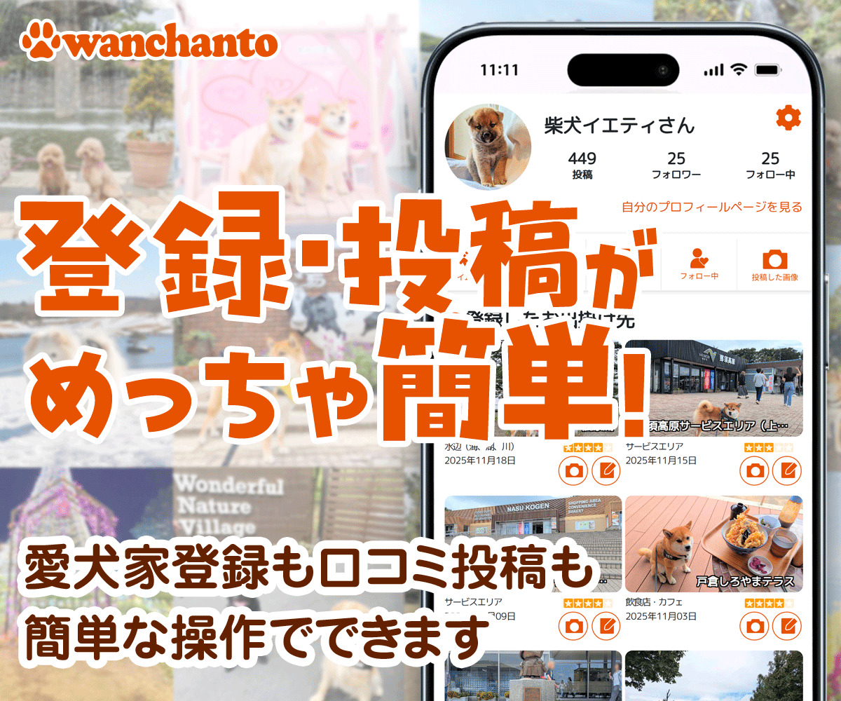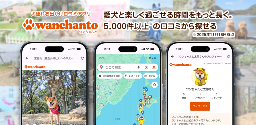 「ワンちゃんと」は、ユーザーの皆様が投稿した口コミで成り立っています。お出かけ先の口コミが増えるほどに、より多くの愛犬家さんとワンちゃんが幸せな時間を過ごせるようになります。ぜひ「ワンちゃんと」を愛犬との素敵な思い出の共有ツールとして使っていただけると幸いです。