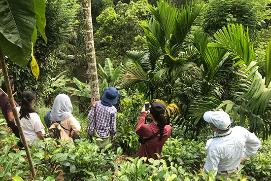 シンハラージャ環境保護区に隣接する有機茶畑を見学するツアー一行。バナナ、ココナッツ、シナモン、ペッパーなど様々な植物が混植され、生物多様性が守られている