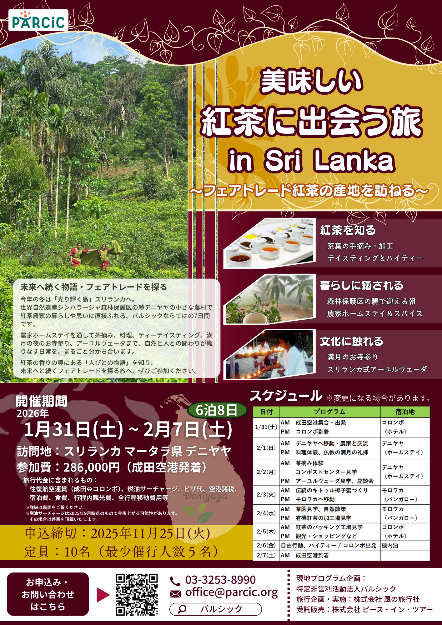 スリランカでの有機紅茶のフェアトレードに取り組む国際協力NGOパルシック(所在地:東京都千代田区、代表理事:伊藤淳子)は、2026年1月31日~2月7日まで、スリランカ南部デニヤヤの紅茶の産地を訪ねるスタディツアーを開催します。2025年11月25日まで参加者を募集しています。