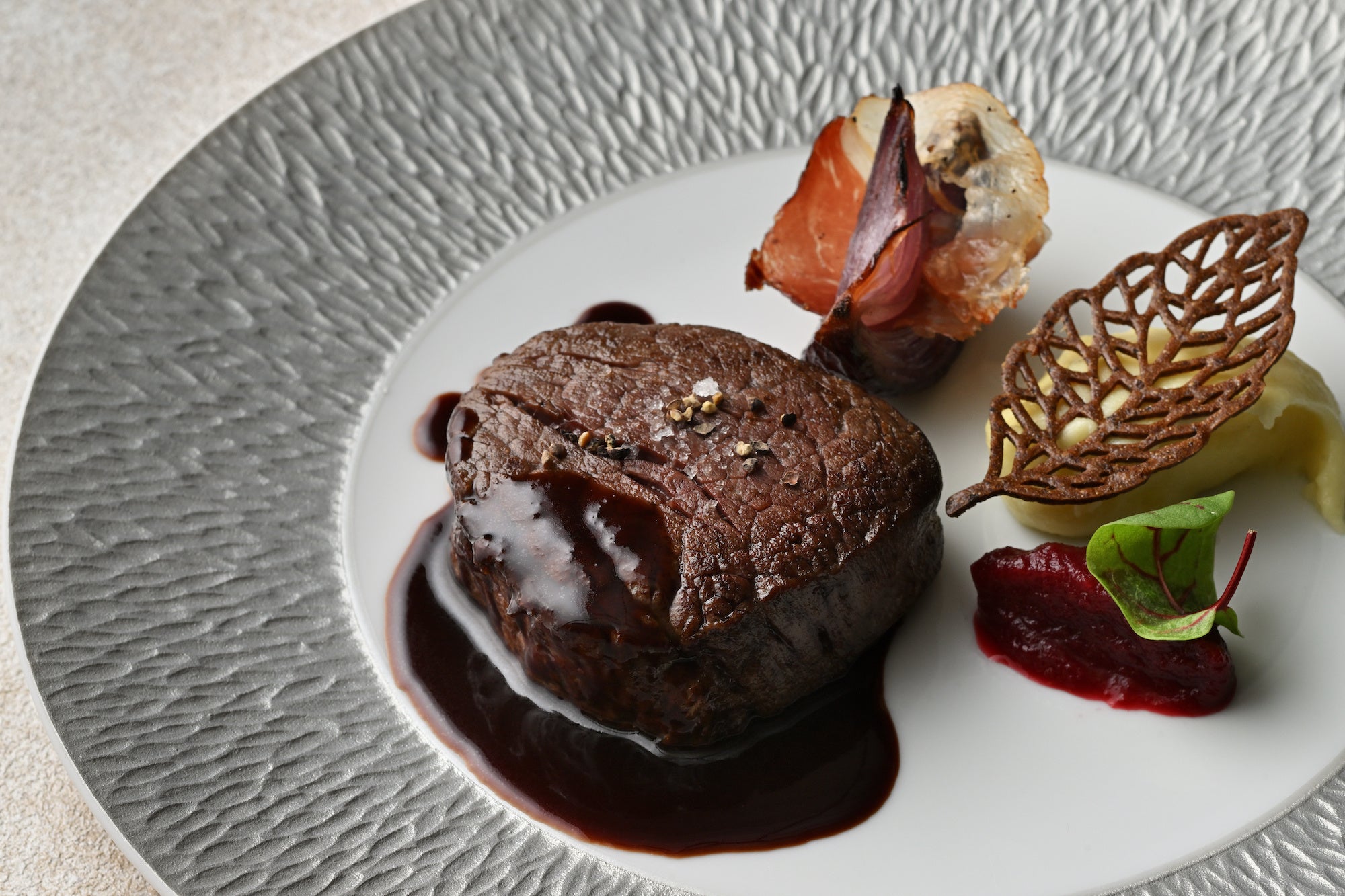 やわらかさの中に赤身肉のおいしさが詰まった国産牛フィレ肉を、表面をカリッと中心はミディアムレアに焼き上げました。フォンドヴォーのコクをしっかり感じる赤ワインソースで、クラシックな味を堪能する一品。ポルチーニのチュイールが落ち葉を思わせ、ビーツのピュレが冬の奥深さを感じさせます。特別な日にふさわしい、あでやかなひと皿です。