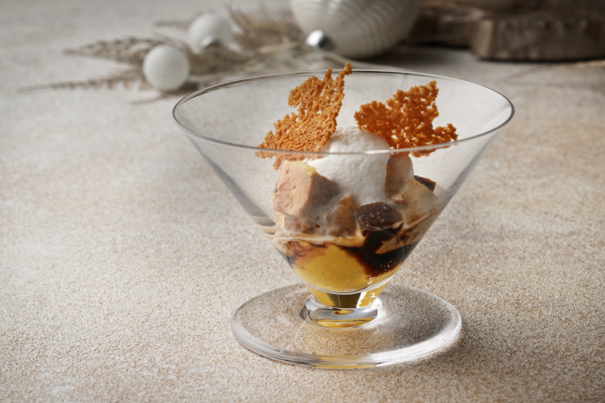 グラスの中にかぼちゃのムース、いちじくの赤ワイン煮、フォアグラのテリーヌが重ねられた一品。縦にスプーンを入れて口に運べば、ローズマリーの香りと共に、フォアグラの濃密な味にいちじくの余韻が重なり、やわらかなかぼちゃがふわりとほどける。食材のひとつひとつが力強く迫ってくる、印象的なアミューズです。
