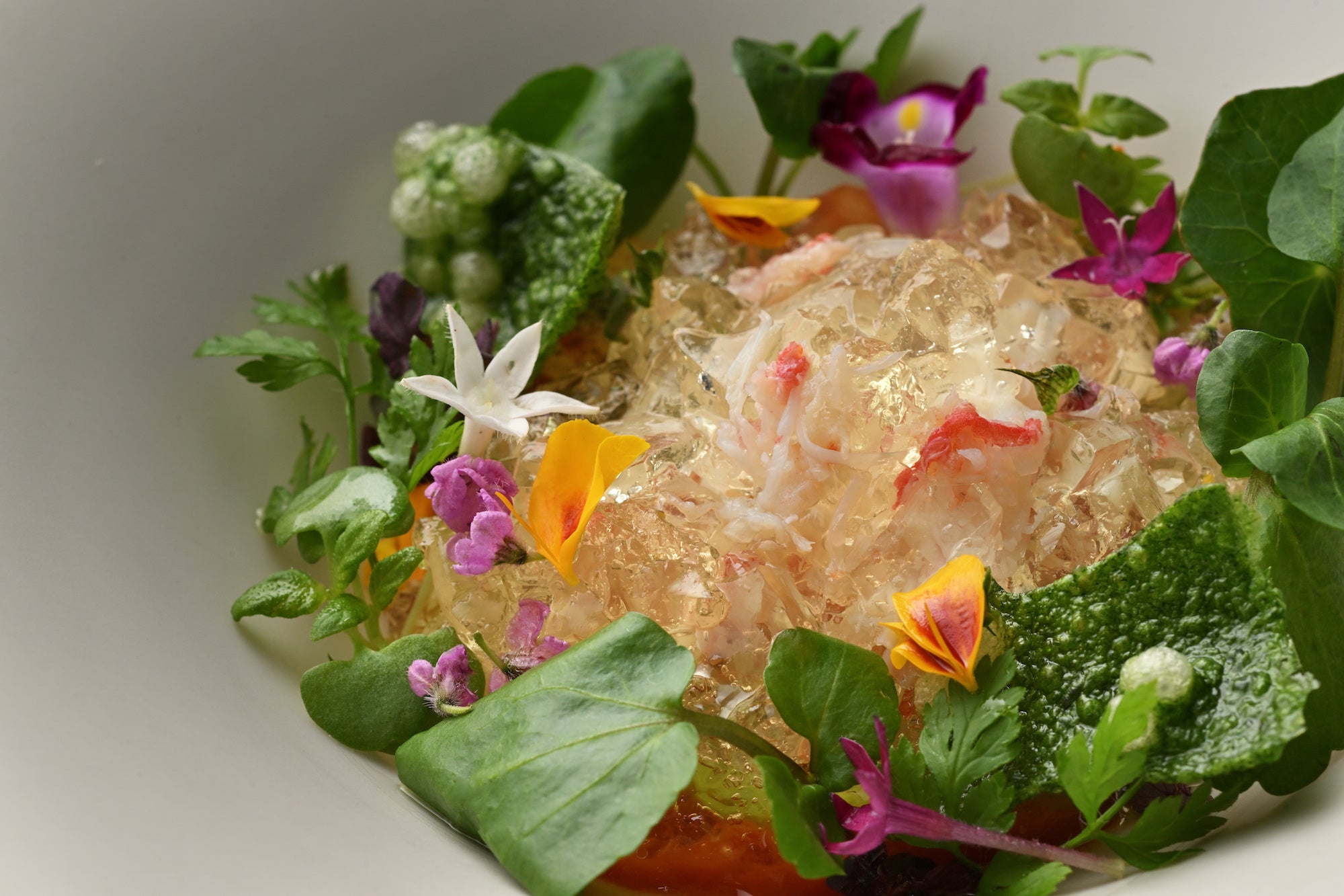 エディブルフラワーとフレッシュグリーン、ケールのチュイールでクリスマスリースをイメージした可憐な前菜。中心には透明なトマトのジュレとたっぷりのずわいがに、アボカドのワカモレがひそんでいます。トマトとシェリービネガーを使った赤いソースが甘みと酸味を添え、軽快な中にうまみもたっぷり。ワインとも相性抜群。