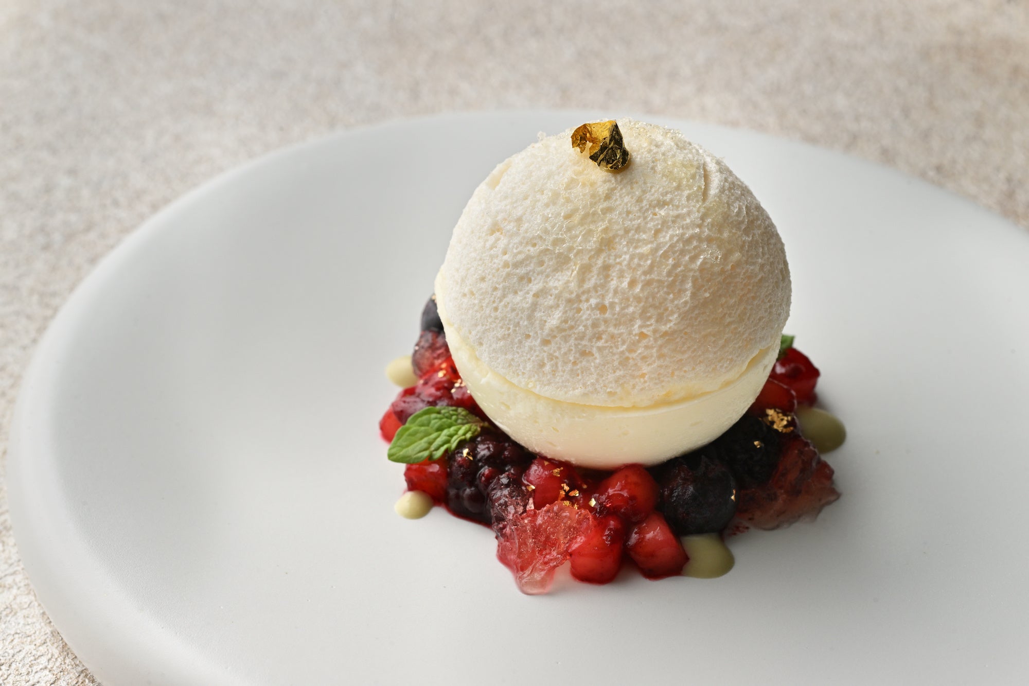 赤いクリスマスリースとホワイトのオーナメントを象った、きらめくデザート。白い球体の上半分はヴァシュラン、下半分はクレームダンジュ。フランスの伝統的なデセールふたつを合わせて、上品な甘さの軽やかな一品が完成しました。割るといちごのソルベとラズベリーのソースがとろけ出し、赤いベリーのチャーミングな味がイキイキと輝きます。