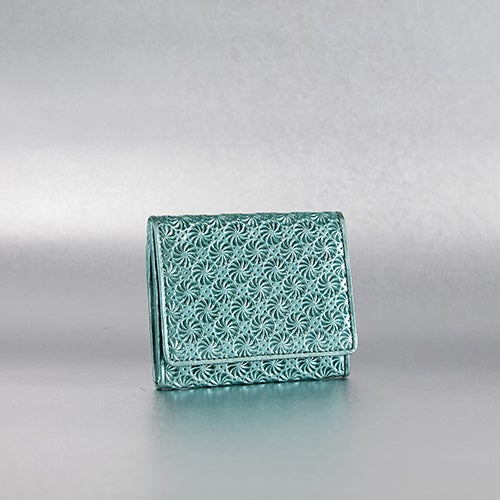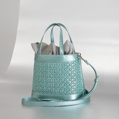 「GIRASOLE(ジラソーレ)」シリーズは、メタリック加工をした牛革に、型押しと型抜きを同時に施した、一見金属のように見える連続的な模様を出したデザインです。