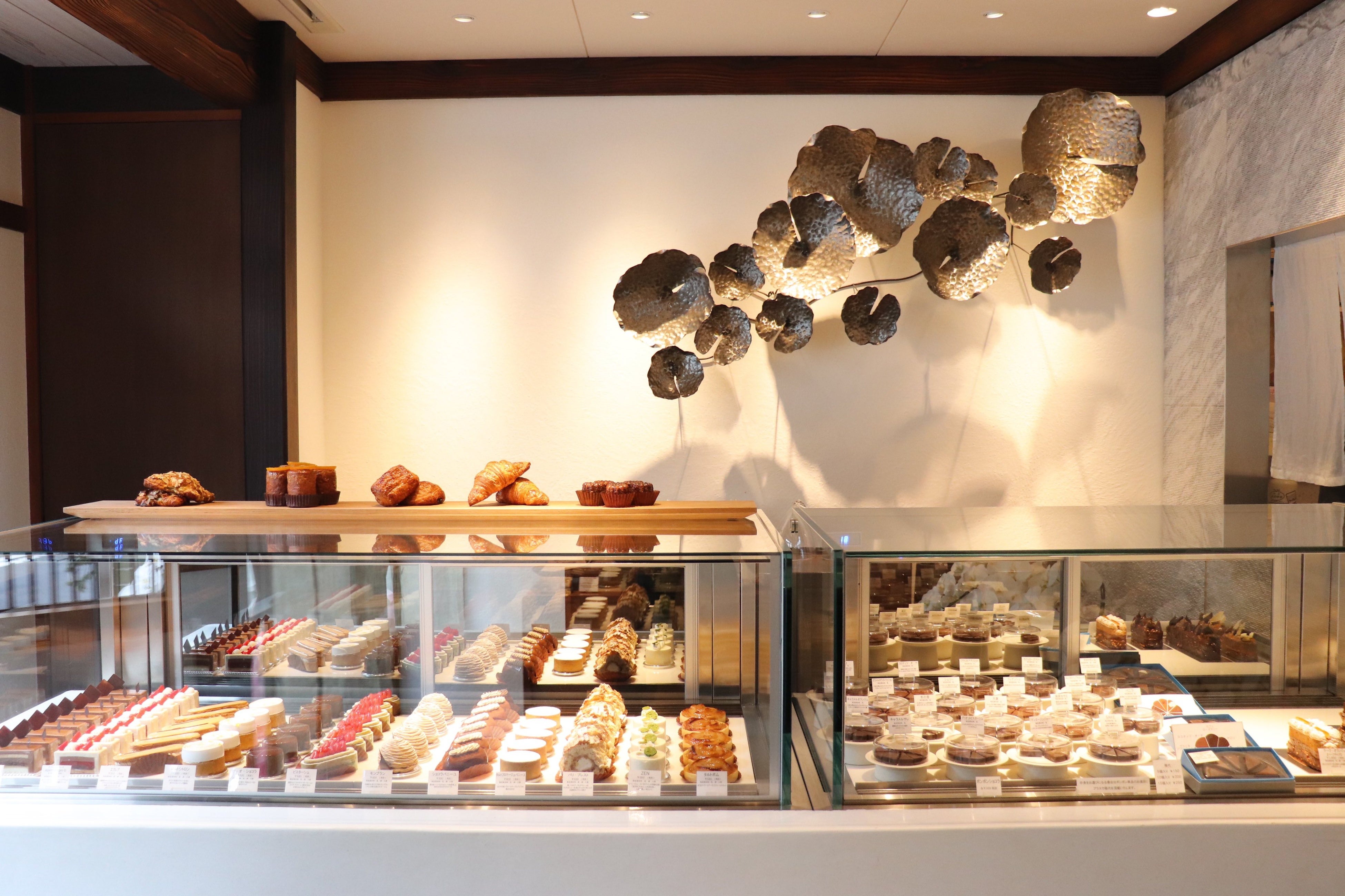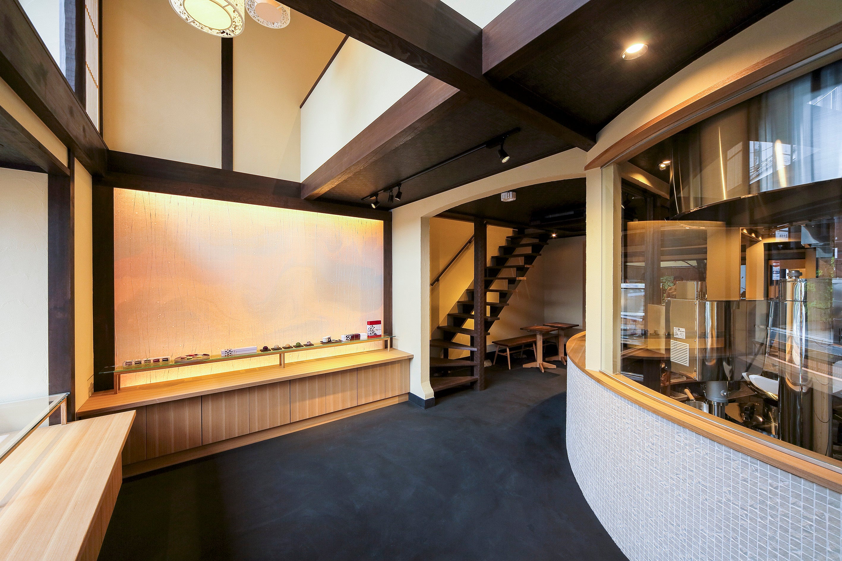 店内は和紙光壁とペンダント照明が落ち着きのある空間を照らしだします。隠れ家のような2階のカフェスペースの窓辺ではスイーツをお楽しみいただきながら季節のうつろいをゆっくりと感じていただけます。建物をはじめ、日本の伝統を感じながらお寛ぎください。