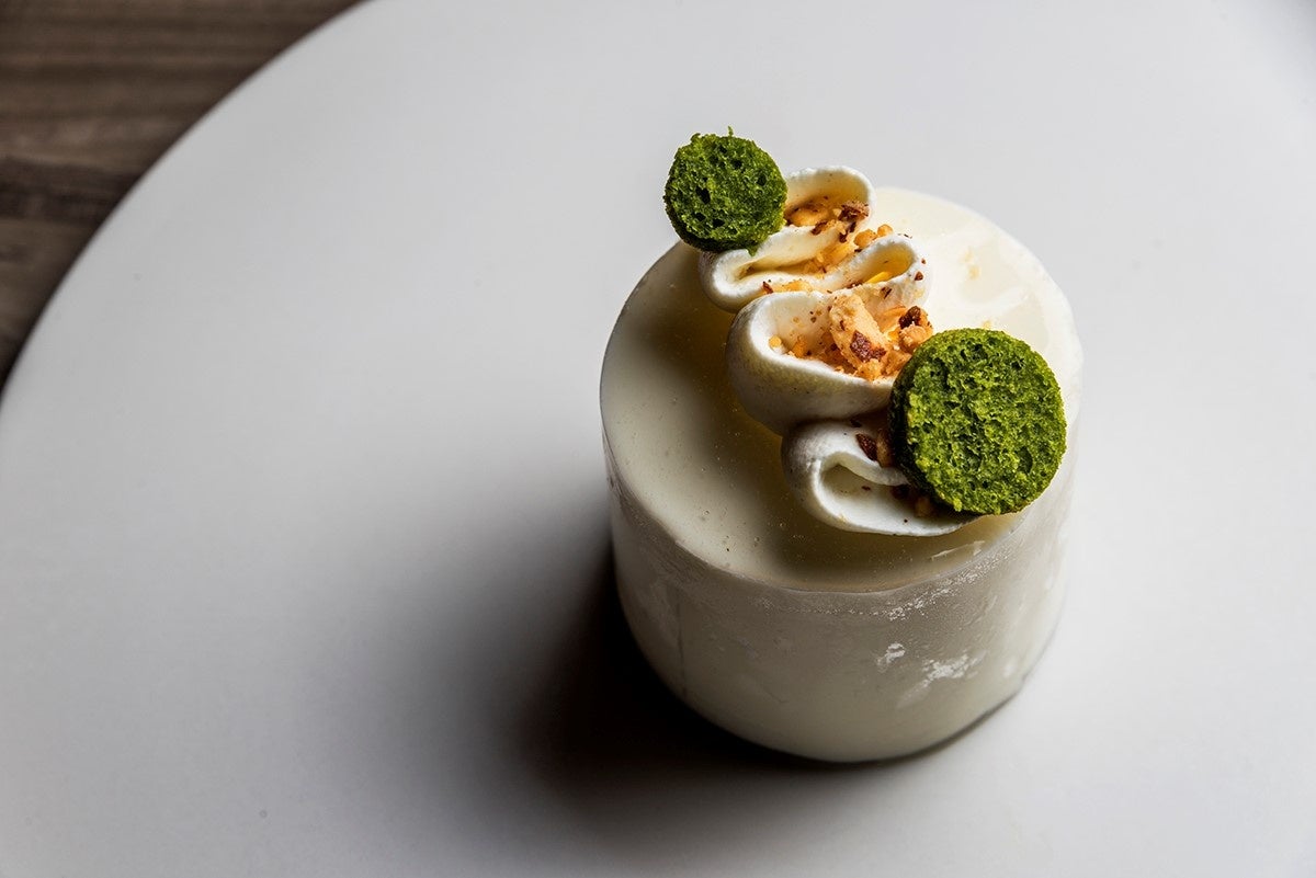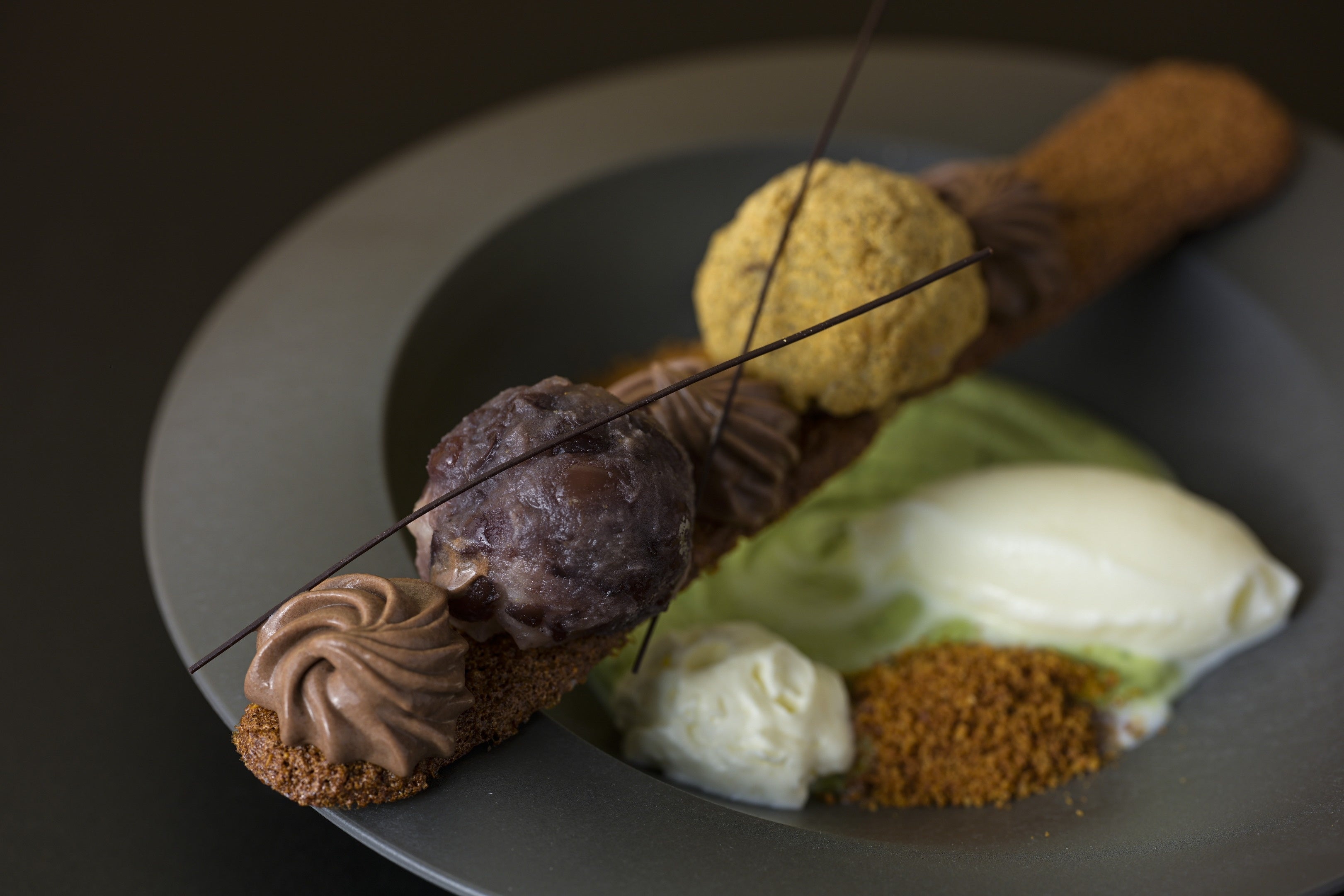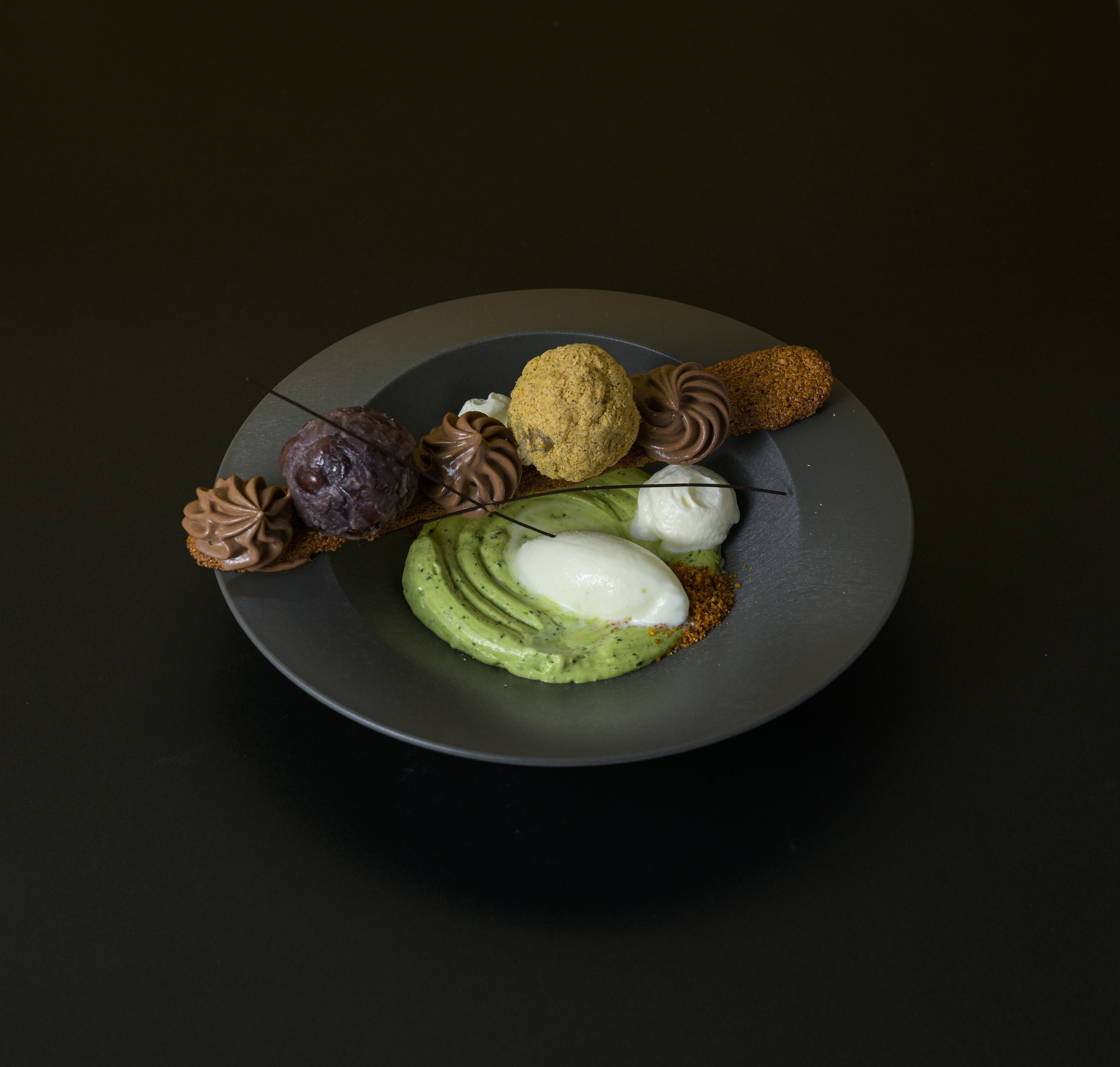 丹波大納言小豆、滋賀羽二重糯を使用したあのん特製の粒おはぎときな粉おはぎ(丹波産黒豆きなこ使用)とムースショコラ(垣本シェフならではの2種のチョコレートを絶妙な配合で仕立てた濃厚なチョコレートクリーム)をカリッサクッ!なシュクセ(アーモンドとマカダミアナッツを混ぜ込んだ香ばしいメレンゲ)の上に交互に乗せ、抹茶クリーム(丸久小山園の抹茶を使用した香り高い泡のような軽いクリーム)、コーヒーエスプーマ(スペシャリティコーヒーのフローラルな香りをしっかりと閉じ込めたエスプーマ)をふわりとあしらい、和と洋が織りなす日本庭園のようなプレートに仕立てました。