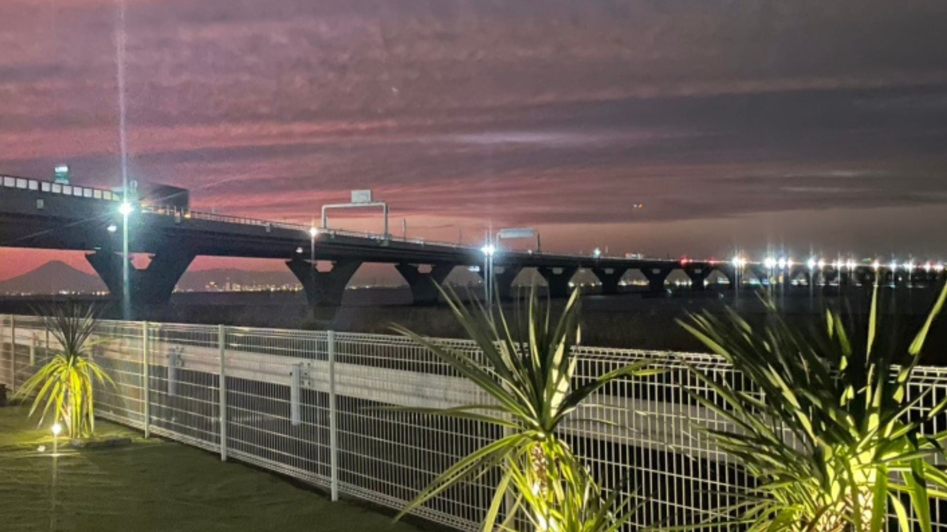ドッグランスペースから夕焼けに染まるアクアラインの美しい光と富士山のシルエット
