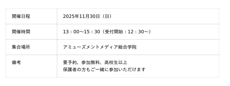 さらに、「エンタメ業界に興味はあるけれど、希望の職種や学科が決まらない」という方へ向けた「AMG学校説明会」も開催。業界全体のお話を交えながら、AMGで学べることやエンタメのお仕事の魅力について学院スタッフが詳しく説明させていただきます。